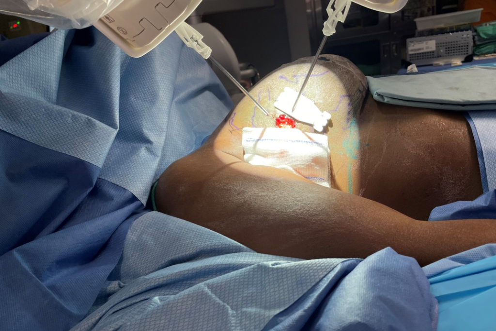 Adult female with painful, swollen right breast post breast conservation therapy. Robotic-assisted LVB performed using Symani and Mitaka Exoscope. Immediate decompression and pain relief achieved without medication.